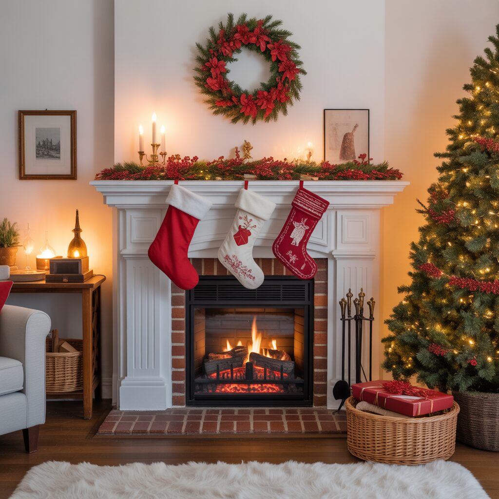 Fireplaces with stockings and warm lighting bring a cozy, homey feel. These backgrounds evoke comfort and holiday nostalgia, ideal for winter days.