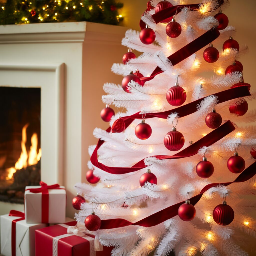Pair a white tree with red ornaments and ribbons for a traditional yet striking look. The contrast creates a festive and cozy holiday atmosphere.