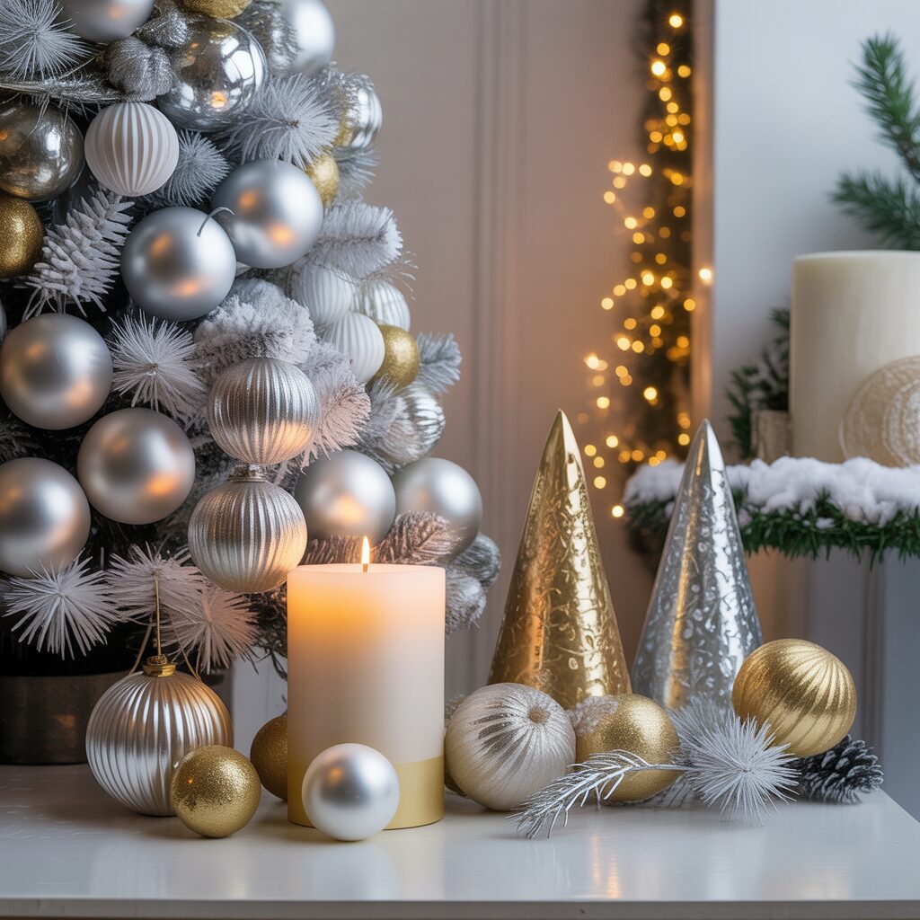 Combine silver and gold decorations to achieve a sophisticated and luxurious style. Metallic accents add sparkle and depth against the snowy white branches.