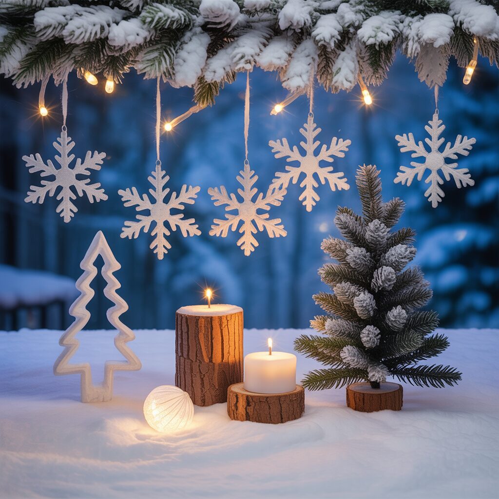 Decorate with snowflake ornaments, icicle lights, and frosted accents. This theme emphasizes a crisp, snowy vibe perfect for a magical winter scene.