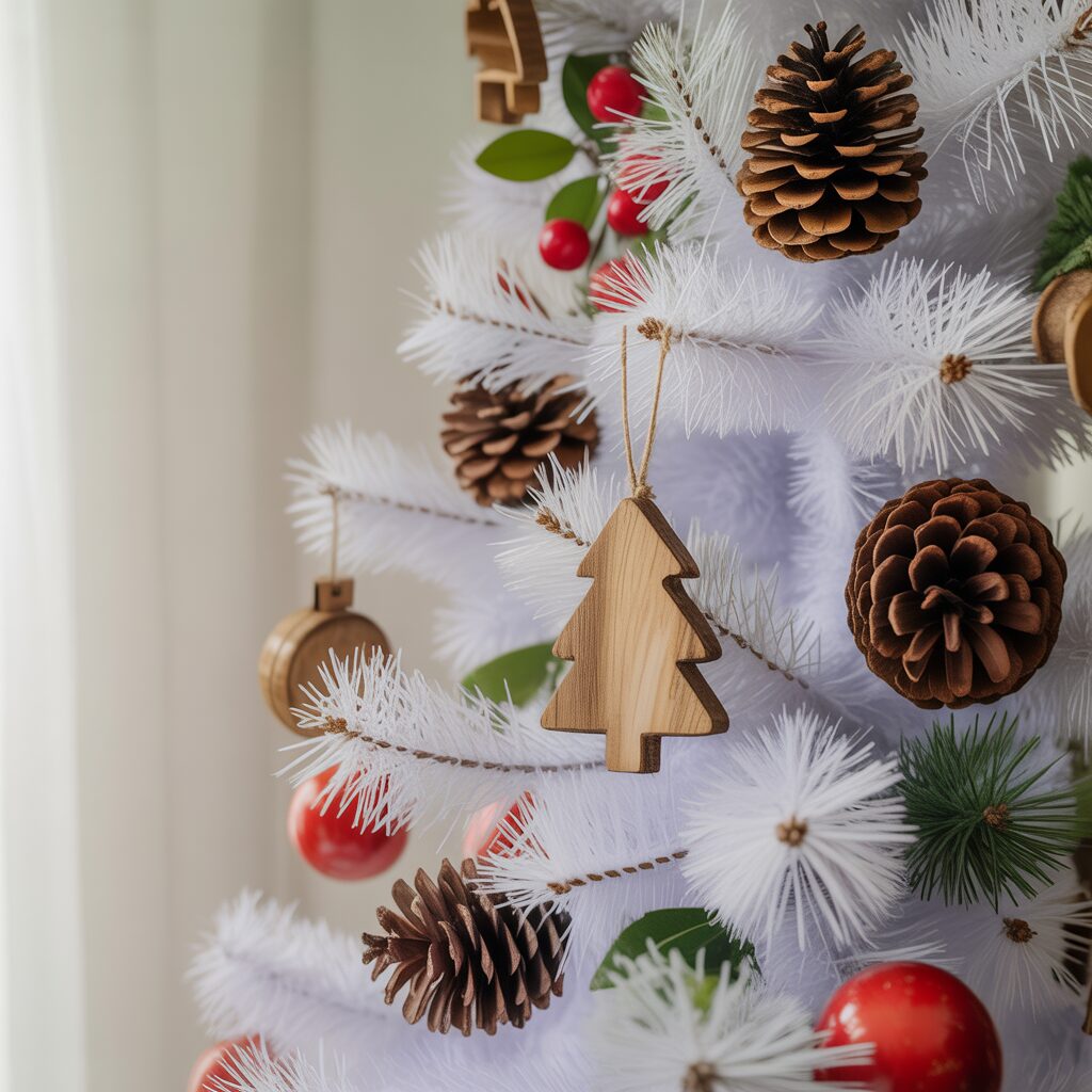 Incorporate pinecones, wooden ornaments, and faux berries for a rustic woodland feel. The natural elements bring warmth and texture to the white tree.