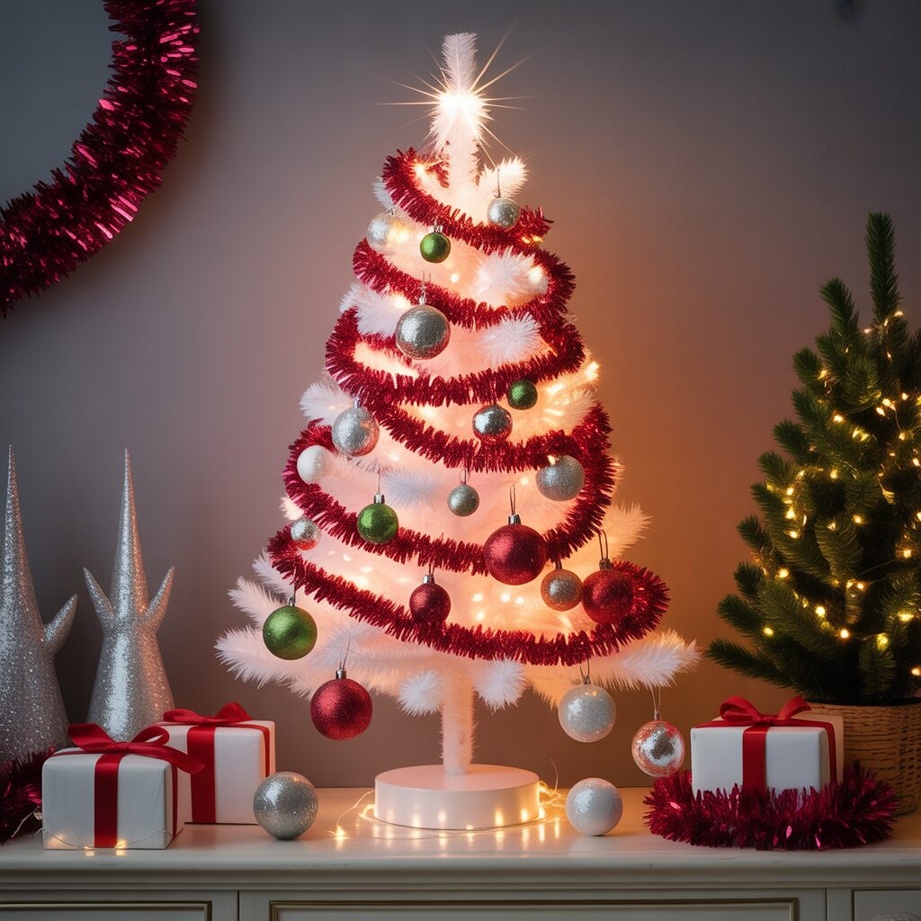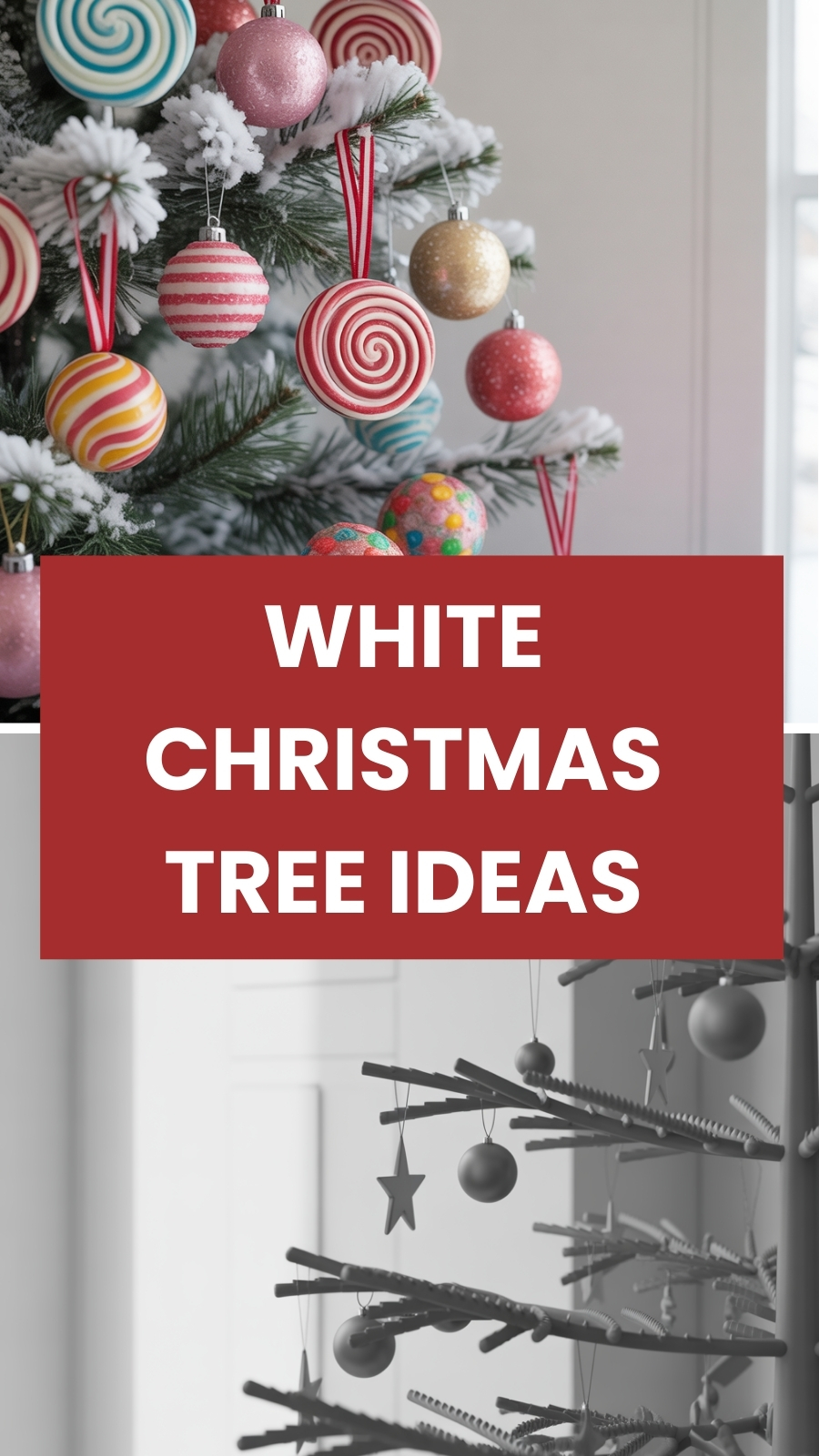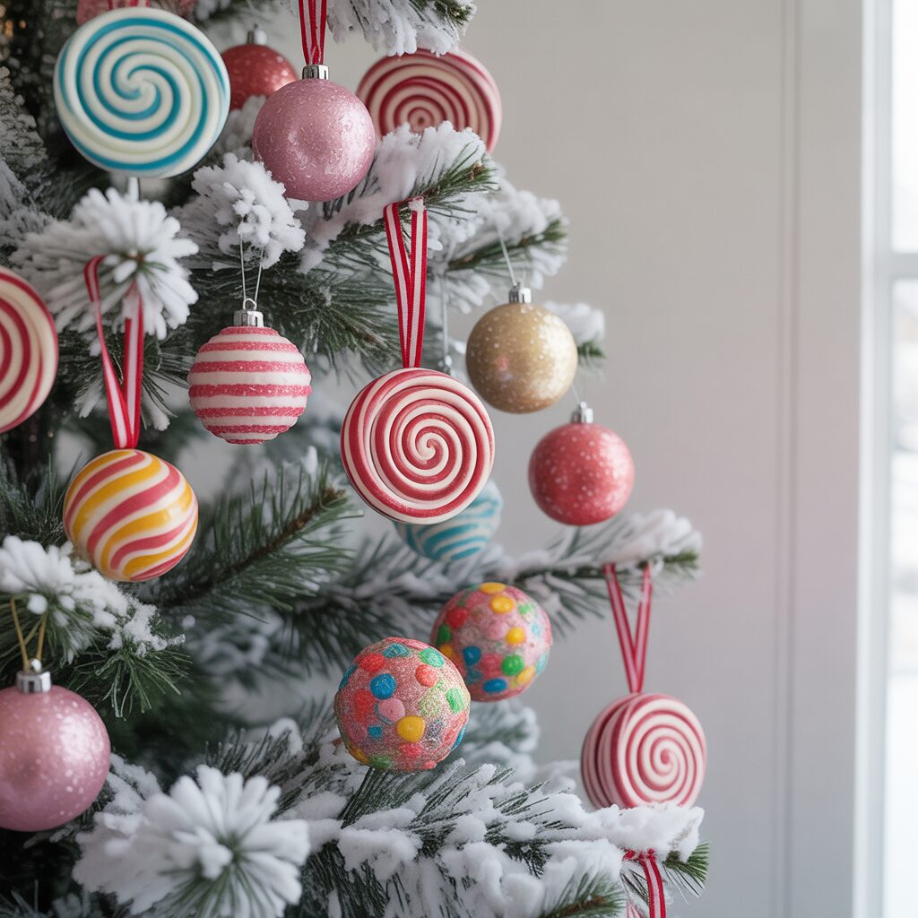 Add colorful candy ornaments, striped ribbons, and festive sweets. This playful approach brings joy and whimsy to the snowy backdrop of a white tree.